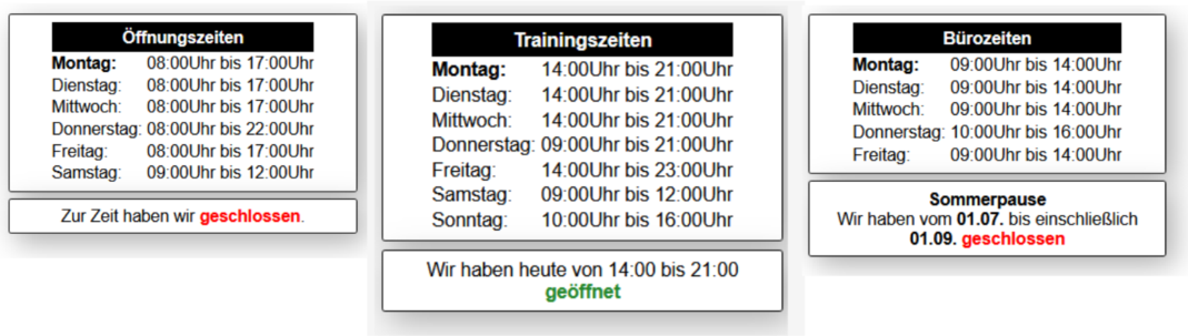 Dieses PHP-Script ermöglicht es, die Öffnungszeiten formatiert auszugeben. Das Styling der Ausgabe kann in einem Editor bearbeitet werden und die Uhrzeiten können in einem Admin-Bereich leicht eingegeben und jederzeit mit wenigen Klicks wieder geändert werden, ohne das Script durchsuchen oder händisch bearbeiten zu müssen.