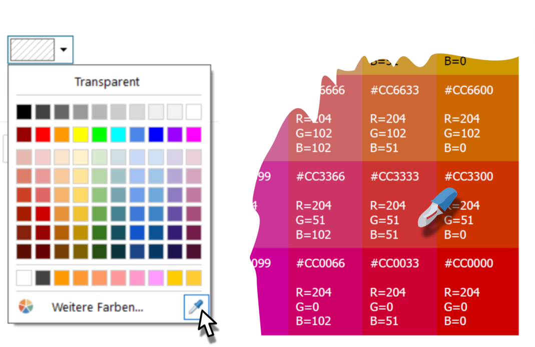 Hier könnenh Sie sich eine PDF-Datei herunterladen, in der 216 websichre Farben im HTML-Code verwendet werden können oder mit der Pipettenfunktion aus der Software "WebsiteX5" heraus die Farbe auswählen können.